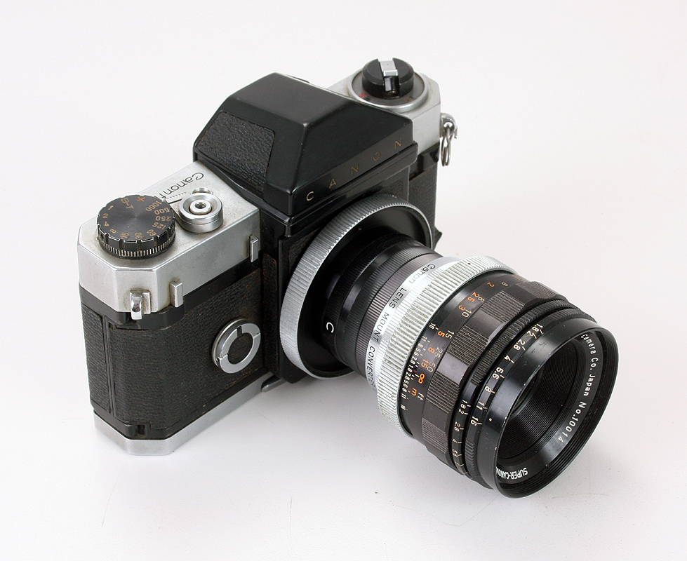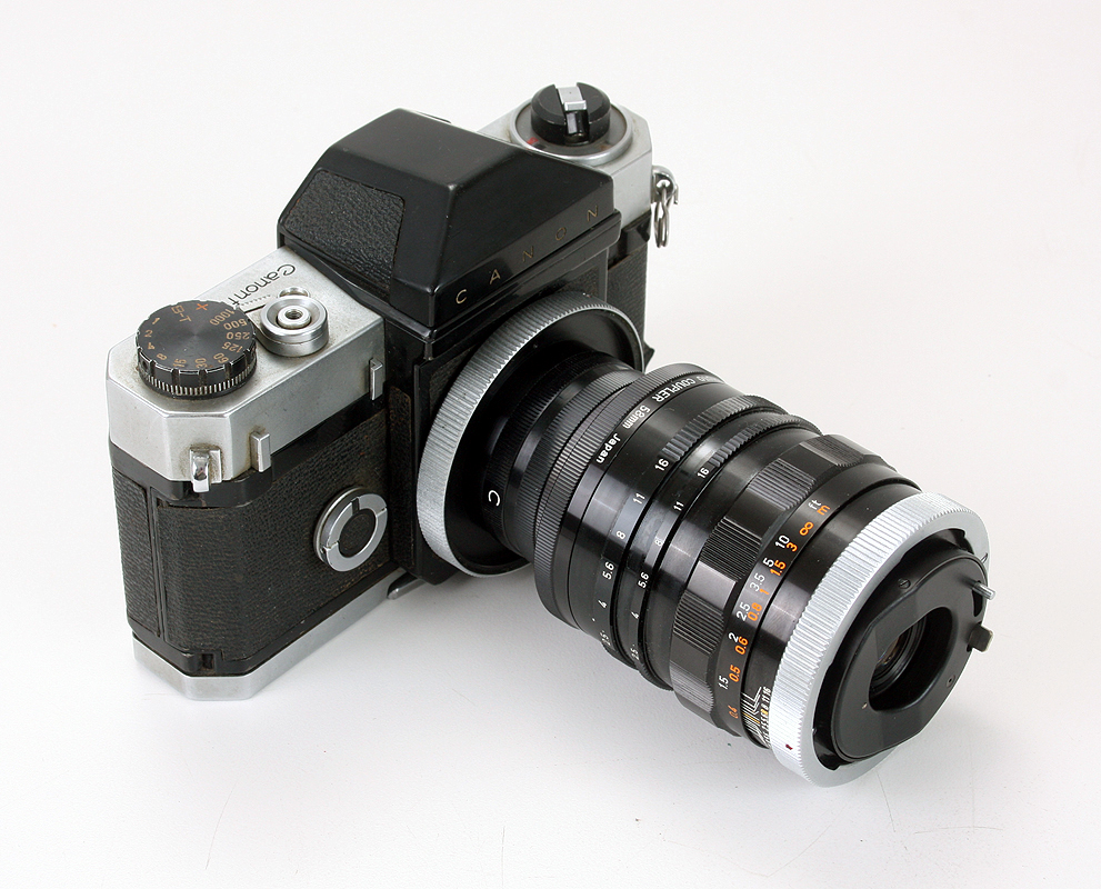 The 50/1.8 Super Canomatic R mounted on a camera using the extension tube set (A, B and C) and