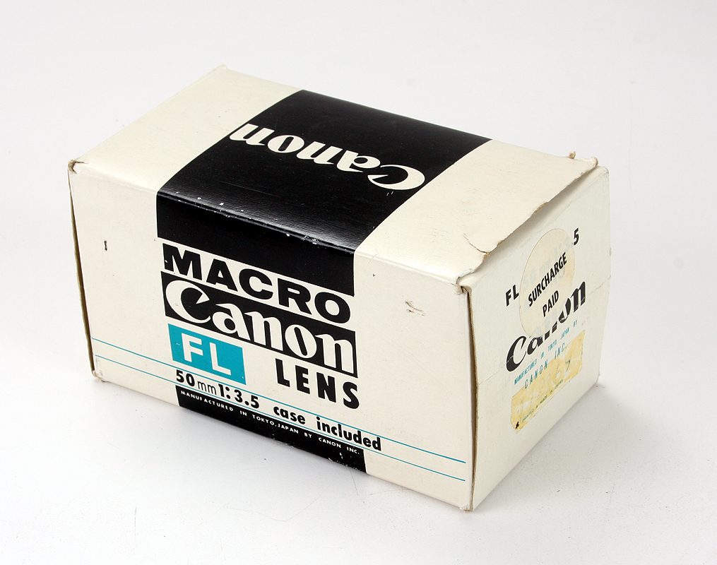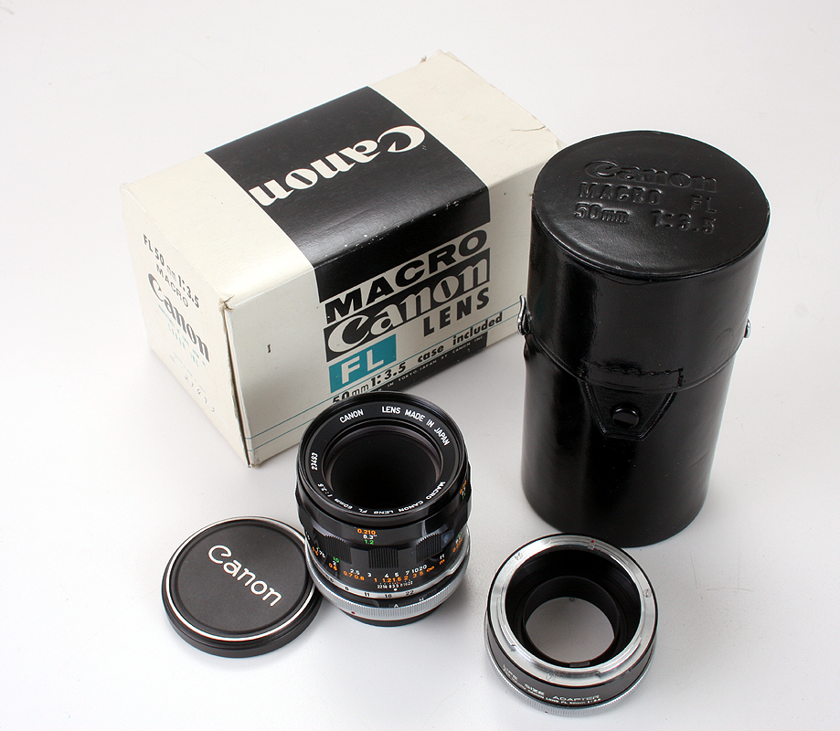 The 50/3.5 Canon FL Macro, with case, matched extension tube and box.