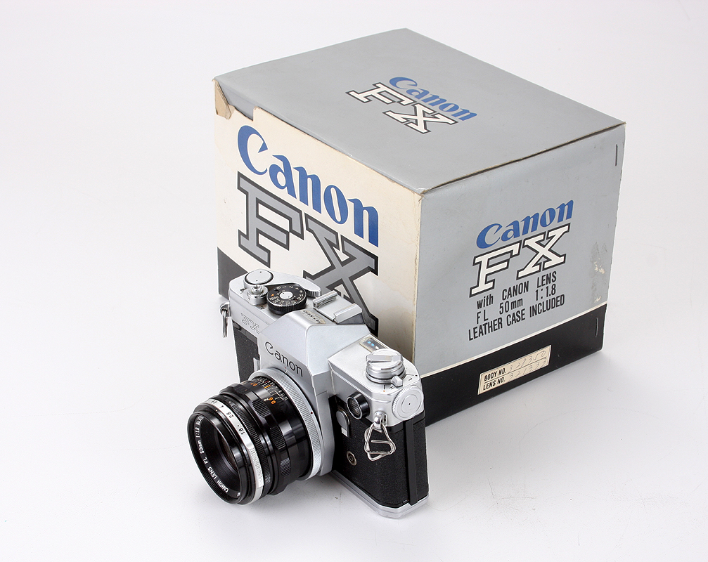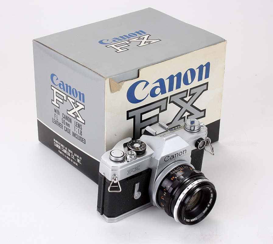 The Canon FX in chrome, with 50/1.8 Canon FL and original box.