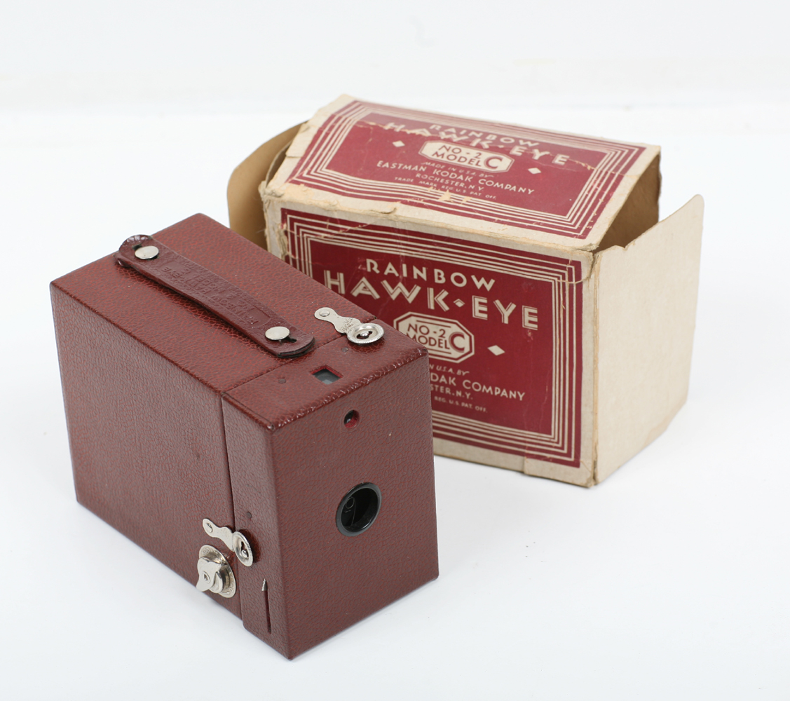 The No.2 Kodak Rainbow Hawk-Eye Model C in maroon, with box.