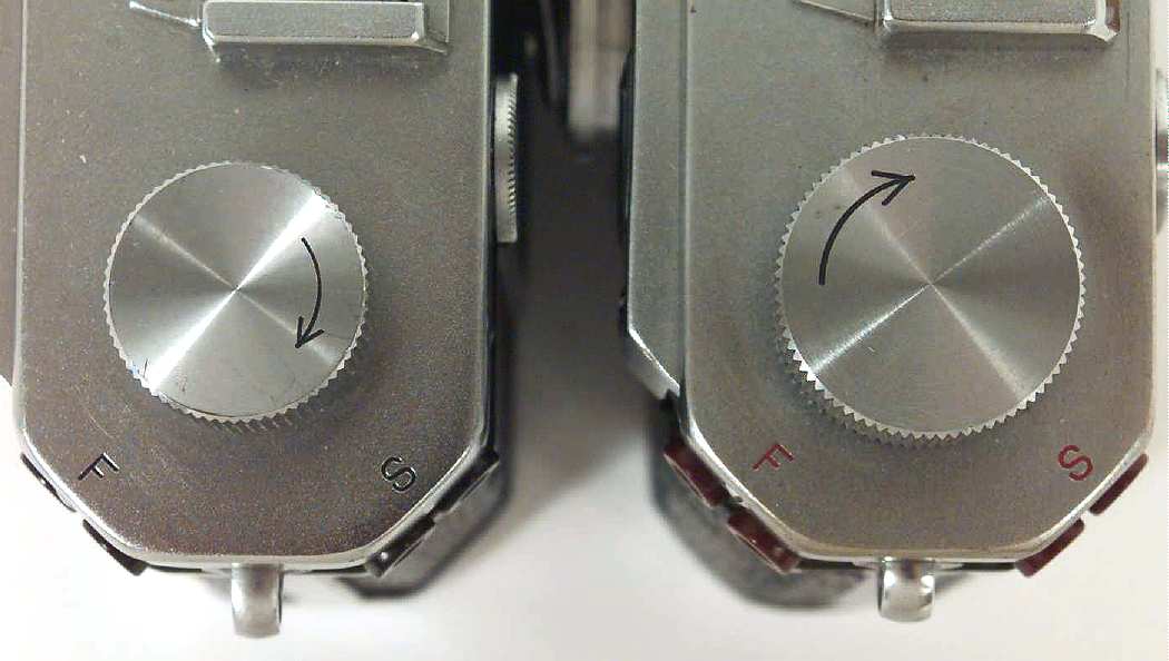There were lots of running changes during the production of the S cameras. The way that the back attaches to the camera changed, as did the size and shape of the rewind knob. Again, cameras were not assembled in serial number order, so the changes didn't appear in serial number order.