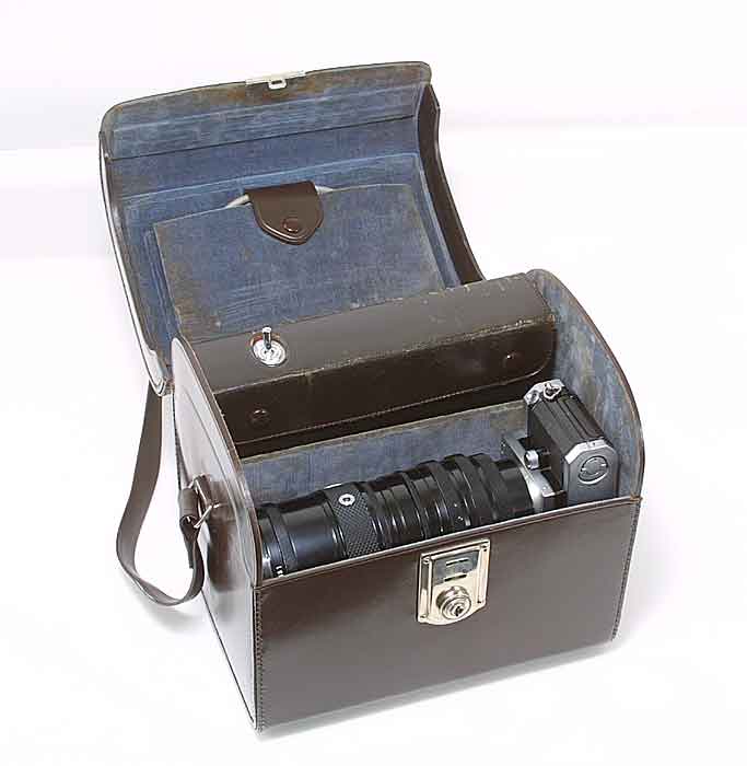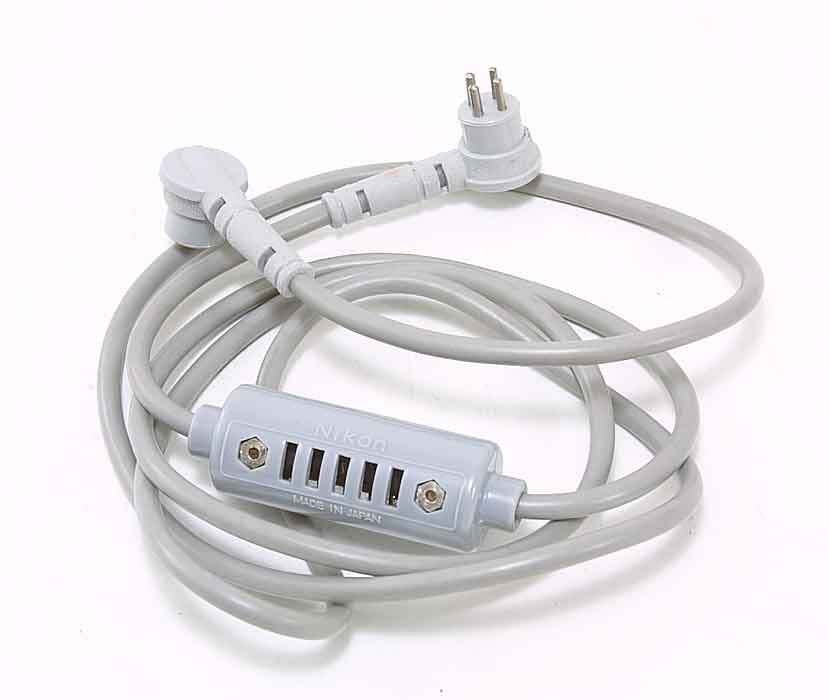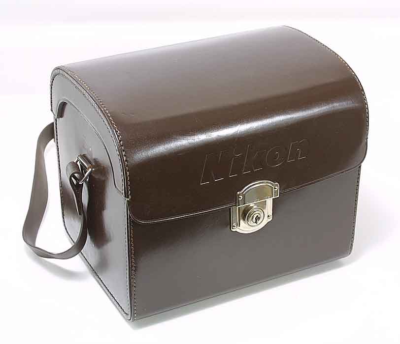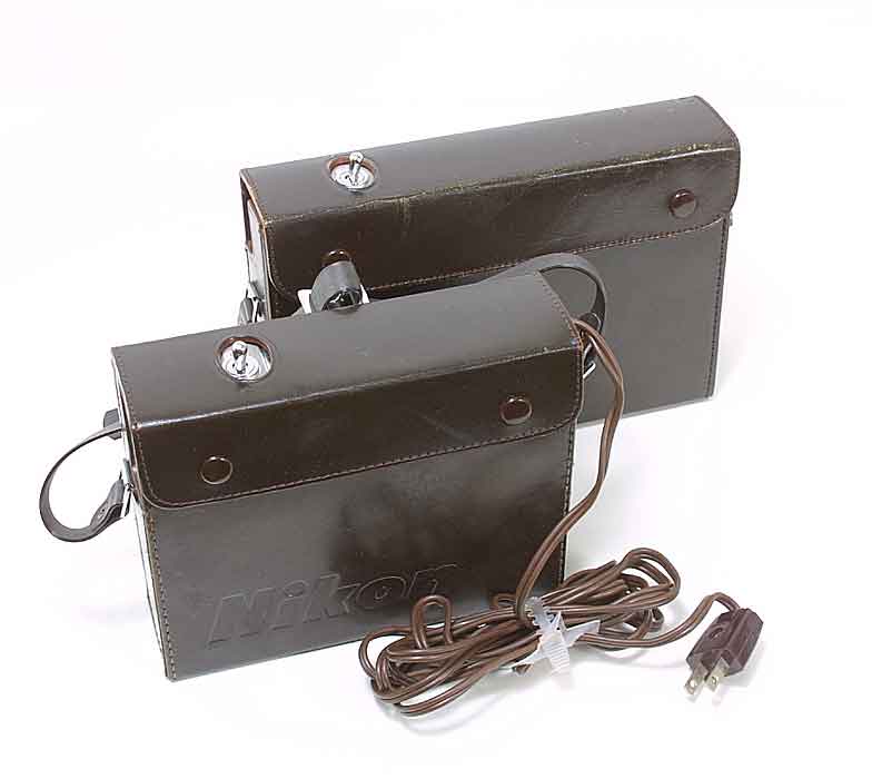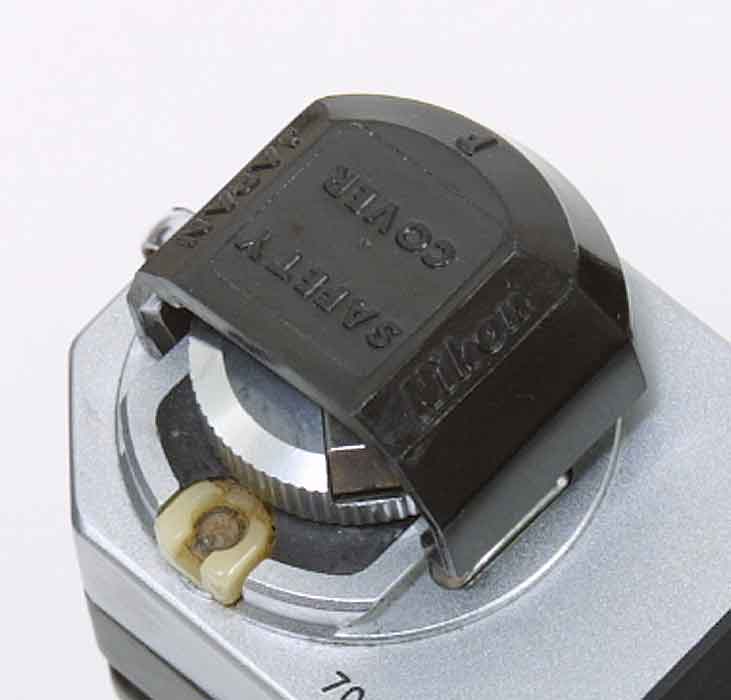 The lens was provided with one of two power sources for the flash, either a DC battery pack or an AC pack. The compartment case which holds the lens has space for either (they share the same dimensions), but not both. The lens was provided with a synch cord, which plugs into the camera's PC socket, and a power cord to connect the flash to the power source. They produced a special cable for the AC pack which reduced the power of the flash and shortened the recycle time. The lens was supplied with front and rear caps (of course), and one other odd accessory. It's a bakelite cover that slips over the rewind knob on the Nikon F where the flash coupler (or flashes designed to fit directly on the Nikon F) would fit. When the flash is fired, the flash contacts become hot, and if you are touching one of them, you will become part of the circuit and receive a nasty shock! This piece is referred to as the "Safety Cover", and is a piece often lost, especially after the Nikon F was often replaced by newer cameras.