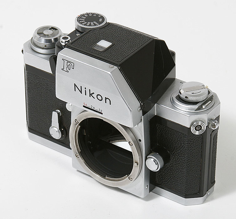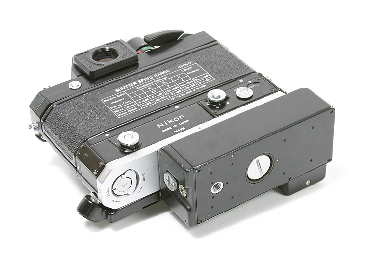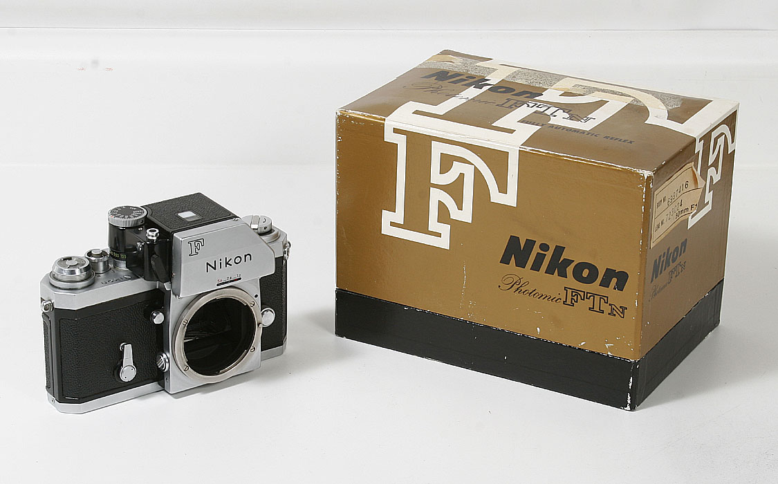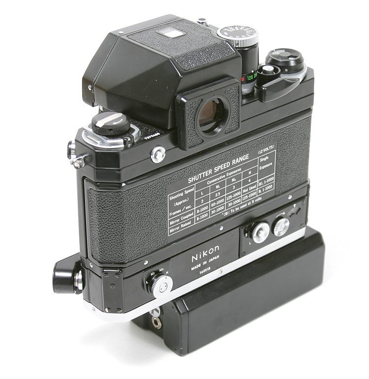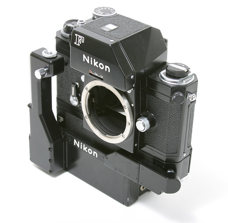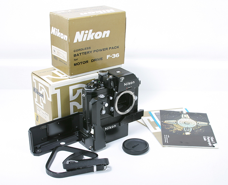 A black Nikon F body with Photomic FTn finder, F-36 Motor Drive and Cordless Battery Pack and boxes