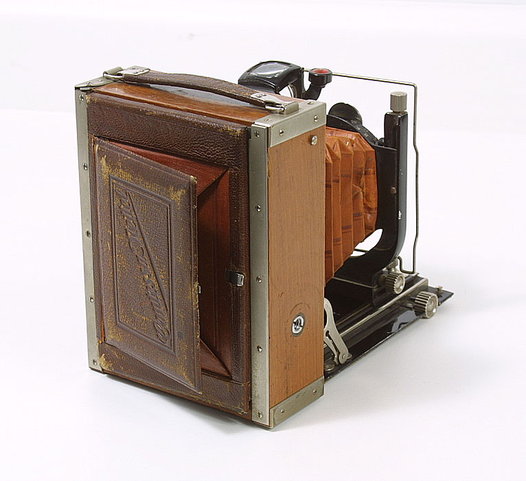wood. It has double extension bellows, with a bed which can be lowered for wide