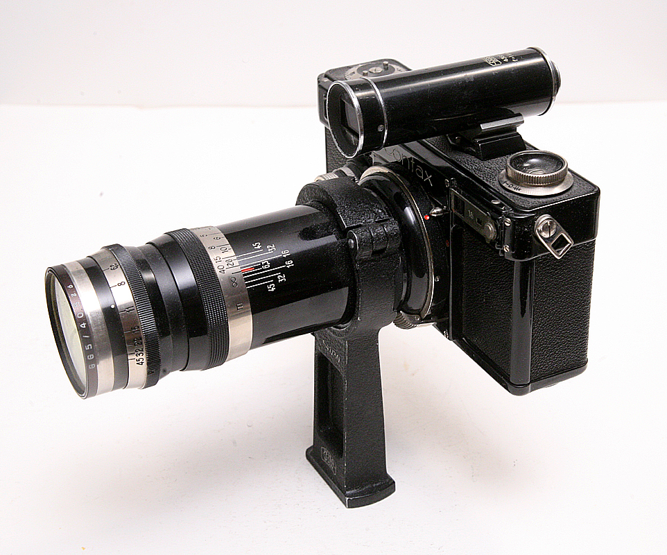 The later version of the black and nickel 180/6.3, mounted on a Contax I with finder and tripod collar.