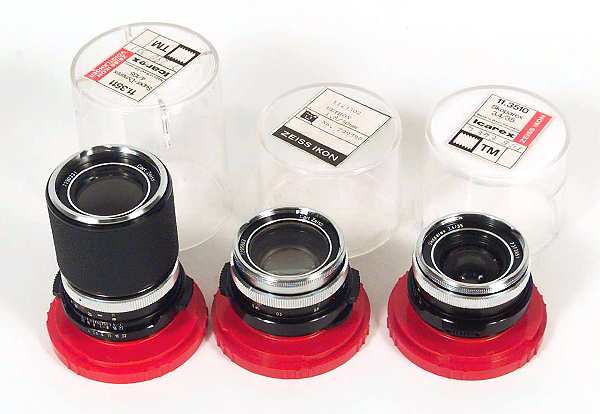 Thread mount lenses with their bubles, left to right, 135/4 Super-Dynarex, 50/1.8 Ultron and 35/3.4 Skoparex.